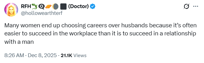 And so women’s desire to insure against bad men is roughly proportional to the badness of men. If women looked upon men and saw that they were good, they would not need to spend decades on degrees and work they despise. And yet many do.
