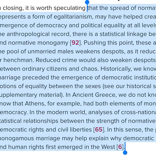 What’s more, while winning men are quietly grinning and losing men are embarrassed, women are gaslit: they have their “freedom”, so what’s wrong? It’s too old-fashioned to acknowledge the asymmetry in preferences for casual sex. Yet as Henrich so eloquently explains in WEIRD, asymmetry may be the defining feature of inter-sex relations: all our behaviours and preferences are downstream of those biological asymmetries.